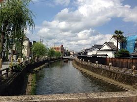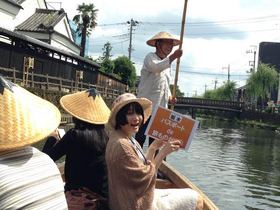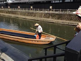 てくてく・・。歩いて5分ほどすると!! 川のほとりへ到着(*^_^*) 川のせせらぎと、マイナスイオン効果で! 夏の涼を感じます♪ あ!! 船が運航している~!(^^)! ふむふむ~? 船頭さんが、なにやら語りながら、船を漕いでいます♪ 近づいてみよぅ~っと^m^ 旅スタ「こんにちわ~!!」 船頭さん「こんにちわ~!!(^<^) ようこそ蔵の街へ!!」 ![]() とっても気さくな船頭さん♪