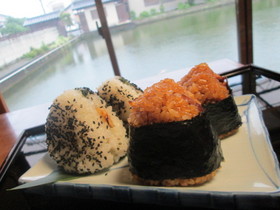 秘伝のタレは、創業以来、注ぎ足しながら、変わらぬ味を守り抜いてきました。 釜屋自慢のうなぎを詰め込んで焼き上げた「うなむすび」は、 長い歴史やたくさんの人の愛情が詰まったおむすびです。 右の茶色の方は、秘伝のタレが浸み込んだタレ味のうなむすび。 左はゴマのついた、うなぎの白焼きが入った塩味のうなむすび。 ![]() これぞ、「和むすび」。