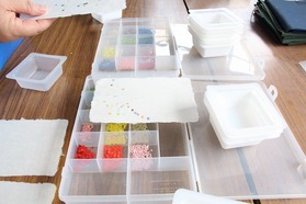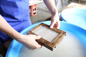 紙漉き体験~! ちょっと緊張気味の旅スタくうちゃん(*^。^*) 和紙のぱりぱりってした感じは、 なんと!! のりじゃないんですって!! 樹木から抽出した、素材を入れて、 混ぜていきます。 手に触れた感触が なんともクセになりそう・・・(^<^) 今日は、はがき作り! ということで(*^_^*) 自分の好きな、 紙(かみ)漉(す)きや、細かく刻んだ色紙(いろがみ)選んで、ちりばめていきます! ![]() この色選びと、