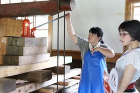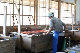 和紙作りの体験をした、はがきをプレスしています! 押板の上に、作ったはがきを置いて、7時間から8時間かけて絞ります(>_<) 重みで、木がちょっとへこんでいる!! 紙質をいためないように徐々にプレスすることが大切なんだそう^m^♪ ![]() 豊富な水をたっぷり使う、和紙作り。