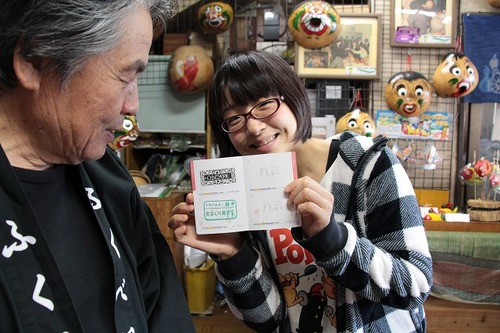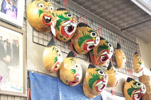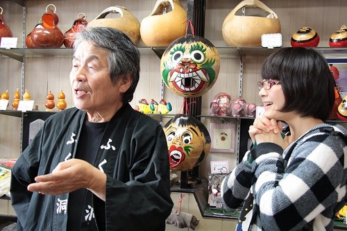 お面のように顔が描かれているふくべ細工、形や大きさはもちろんですが ふたつと同じ表情のものがありませんでした。 おっもしろーい! ・・・・とはいっても、実は百目鬼(どうめき)という鬼から身を守る “魔除け”として作られたものなんですよ! ![]() 店主の小林さん