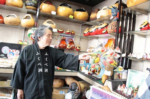 これがふくべ細工 「ふくべ」とは夕顔の実のことをです。この果肉を剥いで(はいで)干した物が 栃木県の特産品“かんぴょう”ですね。 種を取り去って、ふくべを乾燥させて細工したものを「ふくべ細工」といいます! ![]() お店の中は所せましとふくべ細工が飾られてありました!