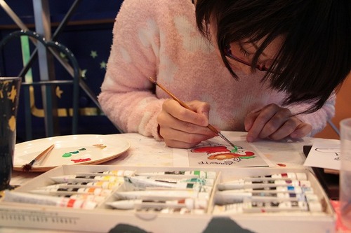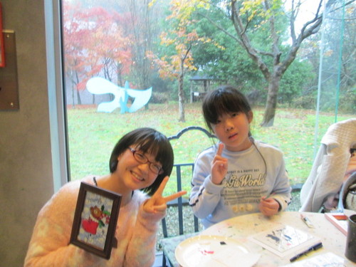 体験コーナーでは「ガラス絵」を描くことができますよ。 それを、額に入れて持ち帰ることができるんです。 自分で好きな絵を描くのはもちろん、たくさん下絵も準備してあるので そこから、セレクトしてもO.K! 旅スタくぅちゃんは、クリスマスバージョンにしてみました! まずは、下絵をマジックで描きます。 その後、アクリル絵の具で塗っていくのですが・・・・ ![]() ポイントは!