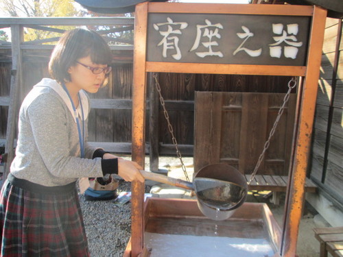 接客や学生に個人授業を行ったところだそうです。 ん?なんか見たことのない物、発見! これは「宥座之器」(ゆうざのき)といって 孔子(こうし)の説いた“中庸”(ちゅうよう)というものを教えるものだそうです。 ~腹八分目~ 人は食べ過ぎもせず、食べ足りなくもない腹八分目の状態が理想・・・ これを“中庸”というのだそうです。 興味深々の旅スタくぅちゃん、さっそくレッツ・トライ! 傾いている器に水を少しずつ入れていくと、あら!だんだん水平になってきましたよ! 1番安定している状態になってきましたぁ♪ しかし、さらにドンドン水を入れていくと・・・・ 水がこぼれて、また傾いてしまいました(>・<) 自分の手で試し、自分の目で見ることで ”中庸”のお勉強ができました!! さて、次は校舎の中に入ってみましょう! ![]() では、お邪魔しま~す!