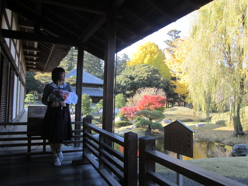 建物の廊下から見た北側のお庭 大きな池と、こちらも色とりどりの景色にうっとり! 旅スタくぅちゃん「こんなところで勉強したかったな~」♪ ![]() |