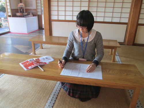 奥に進むと・・・・『足利学校漢字試験』 「あら!?さすが学校だねぇ。童心に帰ってちょっとやってみようっと!」 ![]() まずは、姿勢を正し、呼吸を整えて・・・