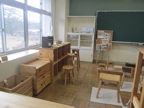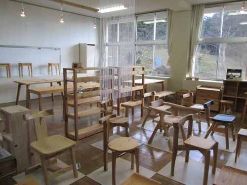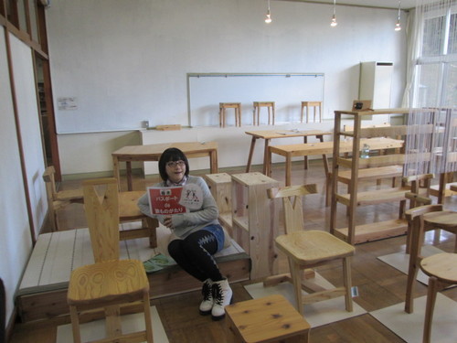 旧・さくら市立穂積小学校廃校舎を利用している「杉インテリア木工館」 一歩入ると・・・木の香りがホワ~ンと漂ってきて、癒されるぅ! 学年別の教室、音楽室、理科室・・・・・。懐かしい!! 「杉インテリア木工館」では、 杉を加工して作った家具の販売もしています! 木のぬくもりってすごいですね。 触ってもひ~んやりしないんです。 旅スタくぅちゃんも“ぬくぬく” ![]() 教室に所狭しと椅子やテーブルが並んでいます。