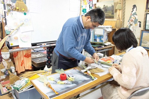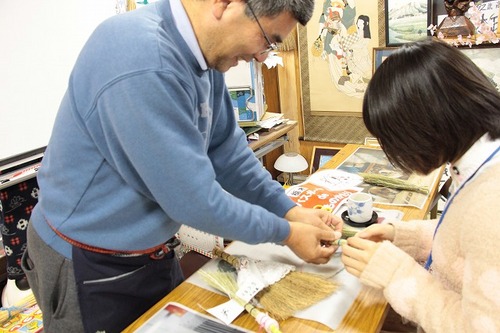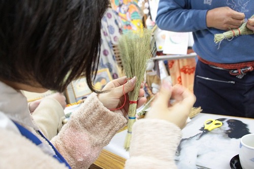 ①のつづきですよ(*^_^*) お店の2階では、 「ミニほうきの手作り体験」が出来ます♪ さてさて!! 早速、ミニ箒作りスタート♪ 15代目の店主の元、 材料を糸で束ねていきます。 旅スタくうちゃん。 真剣に、先生のお話を聞いてます。 ![]() 結構、細かい作業なのです^m^