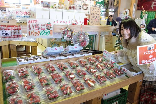 栃木市で収穫される苺や新鮮野菜が並んでいて! なんとも”し・あ・わ・せ”な気分になります☆ 旅スタくぅちゃんも美味しそうな新鮮苺の前で、にこにこ笑顔~(*^。^*)♪ 大賑わいの”ふれあいの郷は、 新鮮な農産物を求めに地元からもお客様が沢山訪れています☆ ![]() 農産物直売所の横には、県内のお土産をゲットできる、