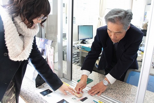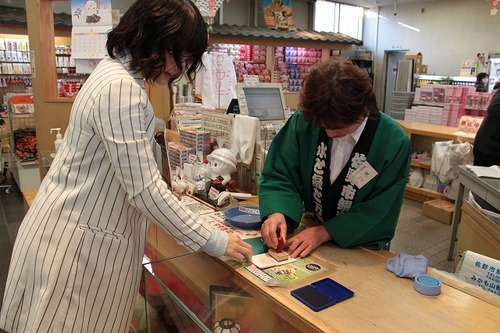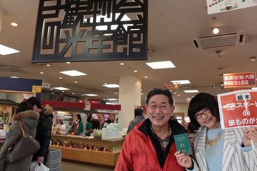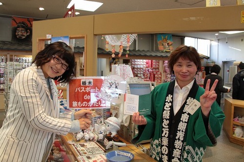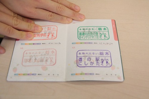 実はな、なんと、ゆるきゃら“さのまるくん”のデザインを考案された方のひとりなんです! さのまるくん誕生までには、実に2年かかったとか! 「佐野とは・・・」とPRするためには、“届けます、佐野の心”と、地元の方々に 知ってもらうことが大事!と熱く語ってくださいました。 ![]() レジの方にスタンプを押してもらっていますよぉ 旅スタくぅちゃん 「ここにお願いしま~す!」 ウキウキ・わくわく・いつもいつもこの瞬間はうれしいな~♪ ![]() そして、大切なミッション、スタンプも押してもらいました!