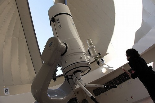 全体の重さは5000キログラム(5トン)! そして、あのアーチ型の屋根がゴーンと開きました! 青空が目に飛び込んできましたよ!!! 「え、え、こんな明るいのに星を見ることができるのぉ!」 ![]() 池田さん「では琴座のベガと金星を見てみましょうか」