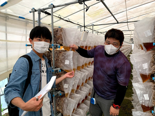 今週は宇都宮市飯山町のしいたけ農家さん、加藤直人さんにお話を伺いました! ![]() 加藤さんは、元々サービス業の仕事をしていたそうですが、30歳の節目の2018年に地元である飯山町に戻り、農家である実家を継いで就農し、菌床シイタケの栽培を始めたそうです。 今回は加藤さんのきのこハウスの中にお邪魔しました!きのこハウスには5段のパイプ棚の上に菌床ブロックがあり、きのこが生えていました!収穫はほとんど終わっていましたが、まだいくつかのきのこが残っていましたよ♪家族みたいにブロックの中で寄り添っていて可愛かったです!次のシーズンのハウスの中も見せてもらいましたが、最初に見たハウスとは違い、菌床ブロックがビニールに覆われていて、分解水という悪い水分を出していました!この分解水は茶色の透明な液体だったので、まるでめんつゆのようでしたよ(笑) 収穫できるのがすごく楽しみです♪ ![]() スマート農業に興味がある、導入を考えているという方に朗報です!