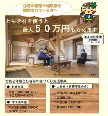 栃木県では「とちぎ材」を使った家づくりを支援しています。 【第4期募集中】 受付期間:10/1〜11/6 ![]() |