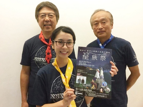 星旅祭のグルメコーナーでは、地元おおたわらの食材にこだわったメニューが沢山。その中から二人がチョイスしたのは「鮎むすび」と、大田原特産の栃木三鷹とよばれる唐辛子を使用した「さんたからあげ」 ピリッと辛いさんたからあげは冷めても味がしみしみで美味しく、あゆ結びはだしのしみ込んだふっくらご飯がにつけた鮎の身を包みこむ優しい味わいです。 ![]() 星旅祭は星と旅と音楽を思う存分楽しめるイベントとなっております。今日ご案内した昼の部でのワークショップや演劇・美味しいグルメの他に、音楽を楽しむ時間として、星空コンサートを行います。ミュージシャンの、カサリンチュ・MILLEA(ミリア)さん・すわじゅんこさん・eastern bloom(イースタンブルーム)のみなさんをゲストにお招きして演奏して頂きます。丘の上の芝生の上にレジャーシートを敷いていただいて自由にご覧いただけますよ。