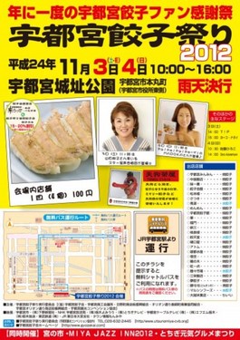 11/3(土)、4(日)10:00~16:00@宇都宮城址公園(雨天決行) 当日は、「餃子祭り」の他に、中心街ではイベント盛り沢山ですので、お車でのご来場はご遠慮頂き、 公共交通機関をご利用下さい。尚、JR宇都宮駅西口より 無料シャトルバスが運行致します。 広報「うつのみや」の裏表紙か、JR宇都宮駅 観光インフォメーションにある「餃子まつり」のチラシを提示すれば 利用できますよ。 その他、イベントに関する詳しいことは、 「宇都宮餃子会」HPをチェック!! |