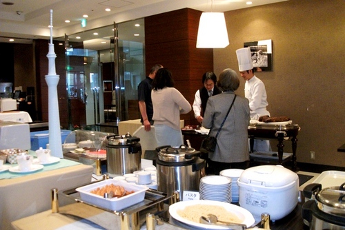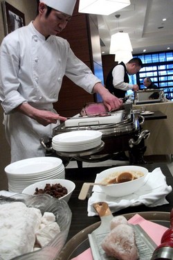 日替わりで 揚げ物(この日は唐揚げ・魚のフライ・エビのフリッター)・パスタ(この日はミートスパゲティ) カレー、魚の骨でダシをとったスープ、 スズキの香草(目の前で魚から切り出してくれる) 目玉はローストビーフ(かたまりをワゴンの上で切ってくれる) パン デザート:さくらのアイス(サッパリしていて、桜餅の味)他、 ドリンク ・ ・ ・ とまぁ、お肉もお魚もある フルコース的な感じでした!! ![]() 目玉のローストビーフは1番人気だそうですが、こちらも 岩塩2種類(ヒマラヤとモンゴル)に
