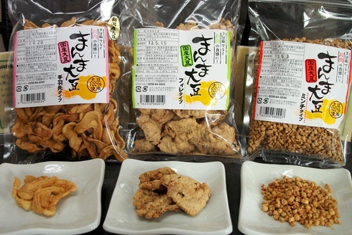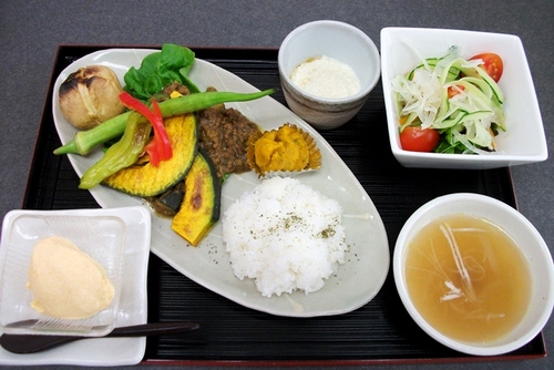 旬の野菜を 主婦目線で調理し、低価格で味わって頂けるようにとオープンされた「健康になる食堂や」 さんです。 旬の野菜を使った日替わりランチは、日によって種類・品数は変わるそうですが、それでもボリューム満点!! ¥680という価格からしたら、大満足な内容です。 しかも、「ちょこっとデザート」まで付いてですよ~。 この日は、ゴウヤとズッキーニ入りのキーマカレーでした。(写真2) 旬の野菜:しまおくらの大きさにビックリしてしまいましたが、それよりも驚いたのが キーマカレーに入っていた大豆肉!!ひき肉と思って食べていたら、これが何と大豆肉。 国産大豆を100%使用している安心・安全なものです。 食感は肉と変わらないのに、脂質が全然違うそうです。 これは、嬉しいですよねぇ。 ![]() そしてお店では、この大豆肉の加工品を販売しています。