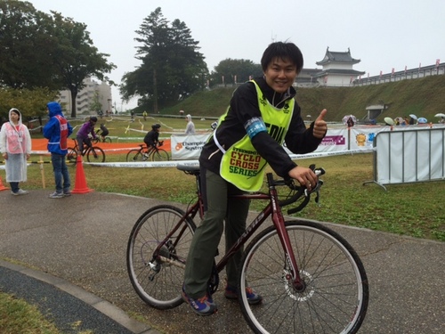 レースディレクター、菅田 純也さんに お話を伺いながら、 大会開催前のコースで 参加しているレーサーに混ざって試走させてもらいました! シクロクロスを初体験です! 城址公園内には みっちりと迷路のようなコースが作られ つづら折りのコーナーが続くテクニカルなコースになっていました。 試走させてもらうと…「楽しい~」 芝生のコースの路面を、ブロックタイヤでつかんで走っていくのは アスファルトロードを走るのとはまた違う面白さがあります。 塗れた芝生は 当然滑ります。 すべって転倒しないためにも、神経を集中させて走らせます。 恐る恐る 走る僕の横では およそ倍のスピードで選手が駆け抜けていきます かっこいい! ※写真は菅田純也さんと 東北シクロクロスPR大使で「シンガーソング・ライダー」の水越ユカさん ![]() シクロクロスの大会は
