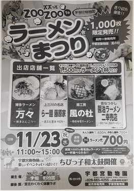 「ZOO ZOO To(ズズッと)ラーメン祭り」を開催します! 毎年この時期に行っている特別イベントで、4つのラーメン店の イチオシラーメンをお楽しみいただくことができます♪ 博多ラーメン 万々、上三川の名店、ラー麺 藤原家 麺工房 風の杜、昔なつかし醤油ラーメン、二幸売店が出店! 動物園の入園料にプラス100円した1500円の特別前売券を ご購入いただくと、通常料金ラーメンが700円のところ、 お好きなラーメンを1杯無料でお楽しみいただけます! 前売り券は数に限りがありますので、お早めにお申し込みください! ![]() つづいて、九尾の狐パワースポットマラソン!!の話題。