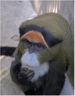 ブラッザグエノン、別名ブラッザモンキーとも呼ばれている、 オナガザル科のサルで、地上にいることが多く、沼地に住んでいるためか 水辺を泳いでいる姿も目撃されている、珍しいサルです! 背中側は緑がかったグレーで、お腹は黒、太ももには白いラインが入っています。 そして、一番目立つのが額にある三日月形のオレンジ色の毛と、 立派な長い白髭です! このような特徴的な綺麗な毛色を持つことから「世界一美しいサル」と 呼ばれています。 「水戸黄門」に似ていることから、黄門ザルという別名もついているそうです! ブラッザグエノンは、チンパンジーとシシオザルの間の獣舎で展示しておりますので、 ぜひ世界一美しいサルに会いに来てください♪ ![]() 「宇都宮動物園」