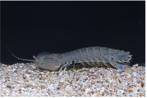 天然キャラ、シャコの「明石家コはく」君! 見た目がエビに似ていますが、 エビやカニのようなはさみ脚を持たず、 代わりに草刈りで使う鎌のような形をした脚を持っている生き物です。 シャコの旬は春で、古くから食用として親しまれていますが、 今は漁獲量が減り、高級品になっているんです。 自然界では水深10~30mの泥底に穴を掘り、 普段は隠れて過ごしています。水槽内でもよく穴を掘る姿が見られ、飼育員が 砂を平らにならしても、またすぐ掘るという一生懸命でかわいらしい一面も見せてくれます。 ちなみに、肉食の生き物でエサのオキアミを食べる姿が迫力満点です! 企画展は来年の1月22日まで開催しています。ぜひ明石家コはく君や、 個性豊かな学園の仲間たちに会いに来てくださいね! ![]() そして、もうすぐクリスマスということで、水遊園の大水槽にはサンタさんが