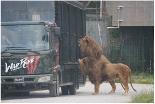「WILDRIDE(ワイルドライド)」です。荷台を檻で囲い、 その中に入ってサファリパーク内を見学するアクティビティバスです。 ![]() このワイルドライドのみライオンエリアでライオンに