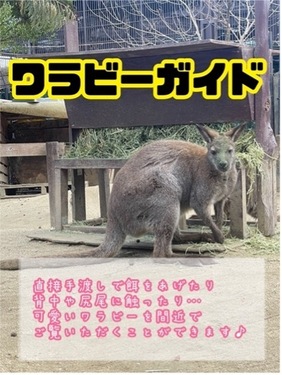 大人気の動物ガイドが3月から再開することになりました! ひとつは、リスザルガイド☆ 群れで生活している リスザルのお部屋の中に入って、至近距離でご覧頂くことができます♪ 飼育員がヒマワリの種を使って巧みにリスザルを誘導しますので、 肩の上や頭の上にリスザルが乗ってきてくれます! リスザルの重さ・毛の質感・あたたかさなどを体感していただくことができます! ![]() そして、3月からワラビーガイドも復活します♪
