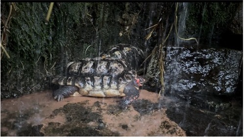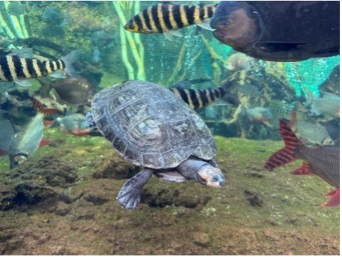 ![]() 次に紹介するのはアマゾン川流域に生息するモンキヨコクビガメ。最大約45cmまで成長し、普段は水中で生活します。