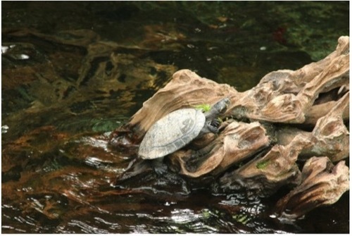 ![]() 水遊園ではオスとメスの2匹を飼育しており、水中を泳いだり魚と一緒にご飯を食べたり、陸で日光浴する姿を観察できます。たまにオスがメスを追いかけてアピールする様子も見られるので、ぜひ静かに見守ってください。