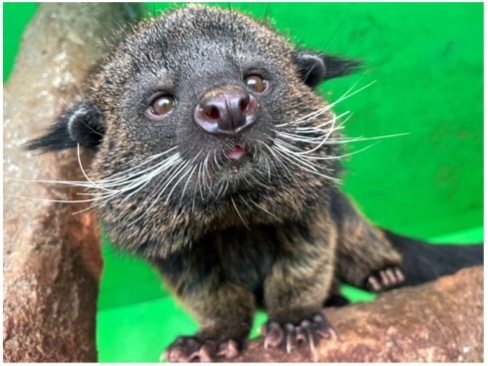 生まれた時のエピソードトーク、お誕生日のお祝いイートタイムを実施。 16日はヒメ、17日はラウトの展示が予定されています。 ビントロングは、体からポップコーンのような甘い香りがする不思議な動物。 樹上性で、長いしっぽを器用に使って枝にぶら下がる姿が特徴です。 ヒメは2023年8月14日生まれ。弟たちが生まれてからは しっかり者のお姉さんに成長し、やんちゃで好奇心旺盛な性格です。 名前の由来は、丸々とした姿がまるでお姫様のようだったことから。 その愛らしい瞳と仕草で、今では看板娘として人気を集めています。 ![]() 一方、ラウトは人工哺育で育った甘えん坊。人懐っこく、
