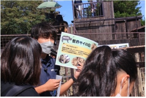 9月22日(金)が「世界サイの日」ということで開催いたします。 「世界サイの日」とは、絶滅の危機にあるサイを守るために、 サイの置かれている現状を広く人々に伝え、 保護することを目的に世界自然保護基金 (WWF)によって2010年に制定された記念日です。 当園では、「ミナミシロサイ」という種類のサイを飼育しています。 サイ科の中で最も大型の草食動物で、口が幅広いのが特徴です。そして、「シロサイ」と 呼ばれますが、特別体が白いわけではありません。ではなぜ「シロ」という名前が付いているかというと、現地の言葉で「幅広い」を意味するwijde(ワイド)を、英語で「白い」を意味するwhite(ホワイト)と聞き間違えて伝わってしまったことがきっかけなんです。 イベントではこういった豆知識や、野生下でのサイの現状など、 様々な解説をサイとふれあいながら聞くことができます。 最後にはポストカードのプレゼントもありますよ♪ 開催時間は13:00~13:30で、サイ展示場前で行います。 ![]() 9月23日、24日はこの特別イベントに加えて、