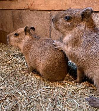 【カピバラの親子の様子】 まずは、カピバラの親子の様子をお伝えします! ついに今月10日から一般公開が始まりました。 「ふれあい広場」という、 うさぎ、モルモットなどの小動物とふれあえる施設があるのですが、 そこへカピバラ親子がお引越ししました! 今年の3月末に生まれた2頭の子供(オスのサクとメスのナナ)、 そしてお母さんのセナに会うことができます。 元気に成長中の子どもたちを温かく見守って下さい。 大きさは、大体30センチくらいです。 サクはお母さんに付いて回っていて、 ナナは自由に動き回っていて、 二匹でじゃれ合ったりと、とても活発です。 ![]() 【ビントロング】
