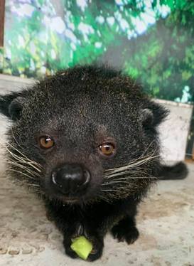 次は、ビントロングの話題です。 ビントロングとは、ジャコウネコ科に属する猫の仲間で、 別名「クマネコ」とも言われます。 クマのような顔と真っ黒な体、 長くて太いしっぽが特徴です。 熱帯雨林などのジャングルに生息していて、 主に木の上で生活をしています。 しっぽを木に巻き付けて、 自分の体重を支えることができます。 クリクリのお目目をしているのがメスの 「メラティ」ちゃんです! インドネシア語で「ジャスミン」 という意味があります! ![]() そしてたれ目でかわいらしい子が